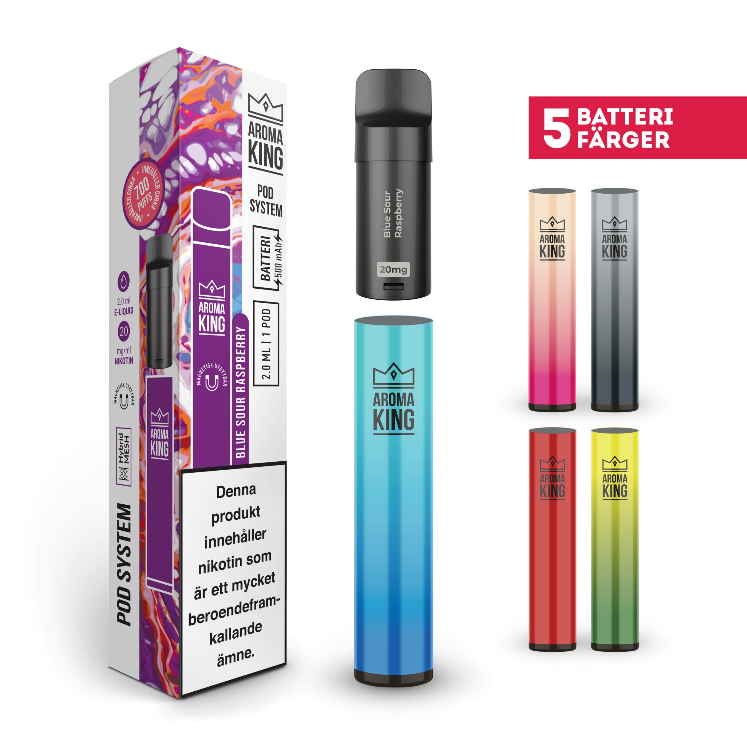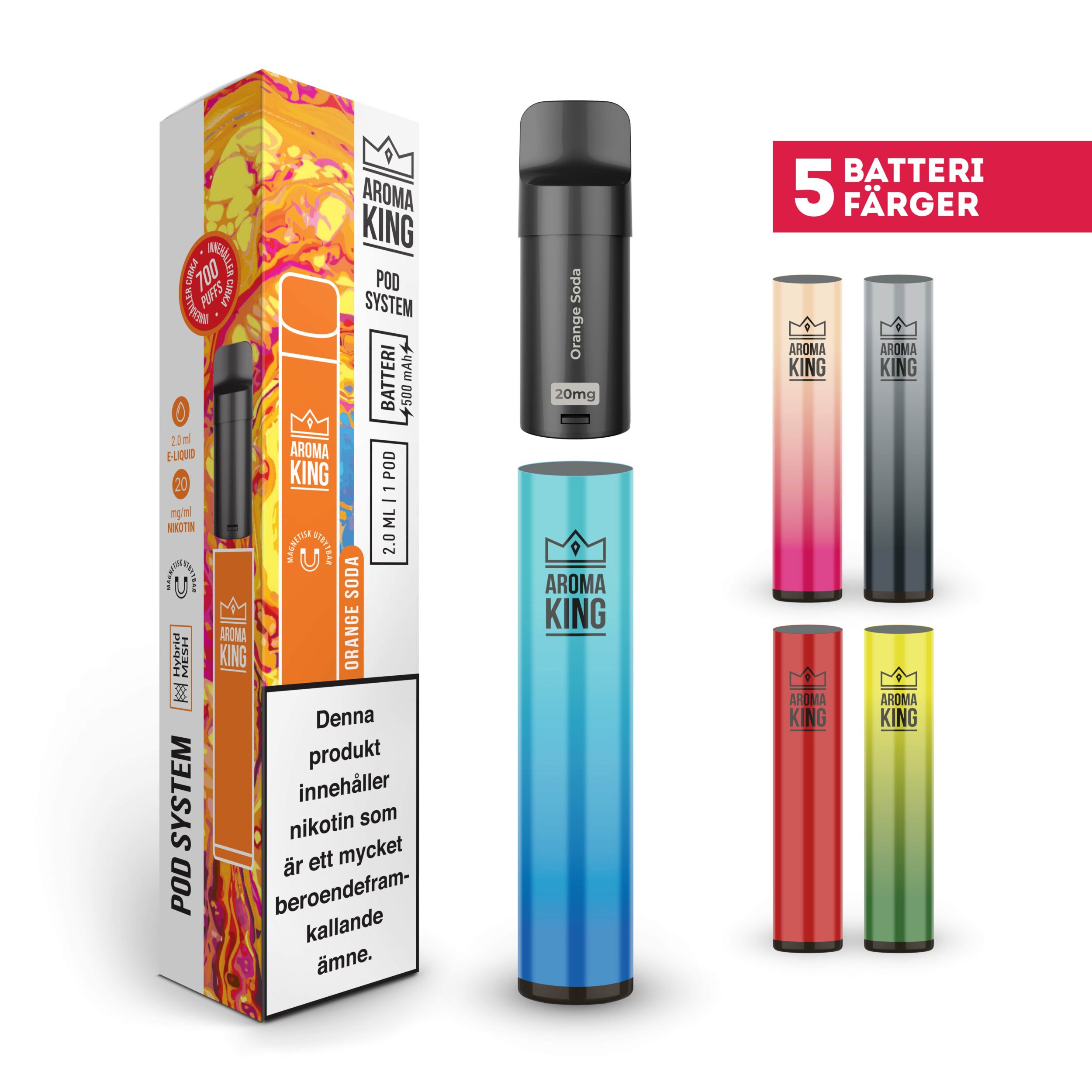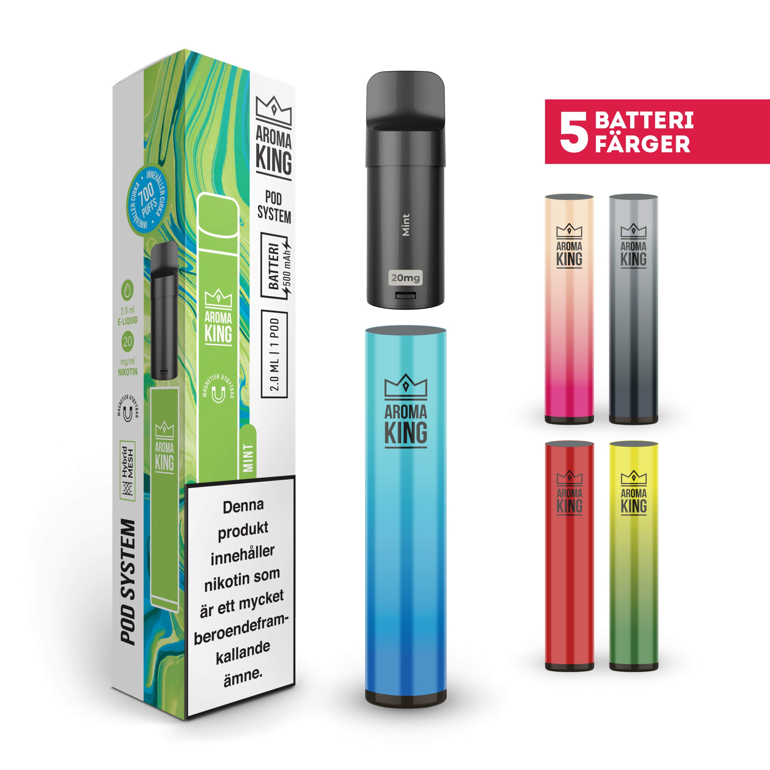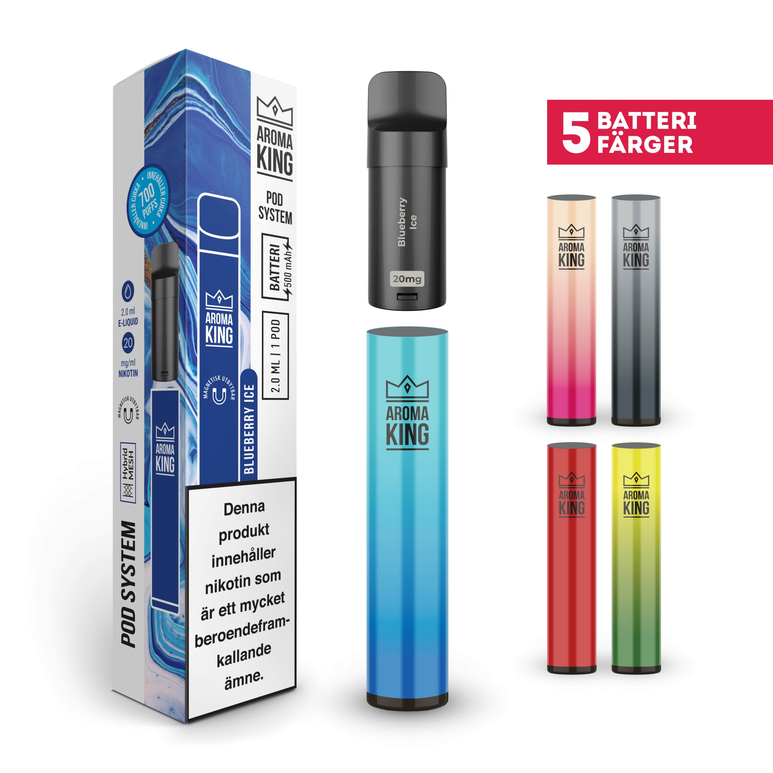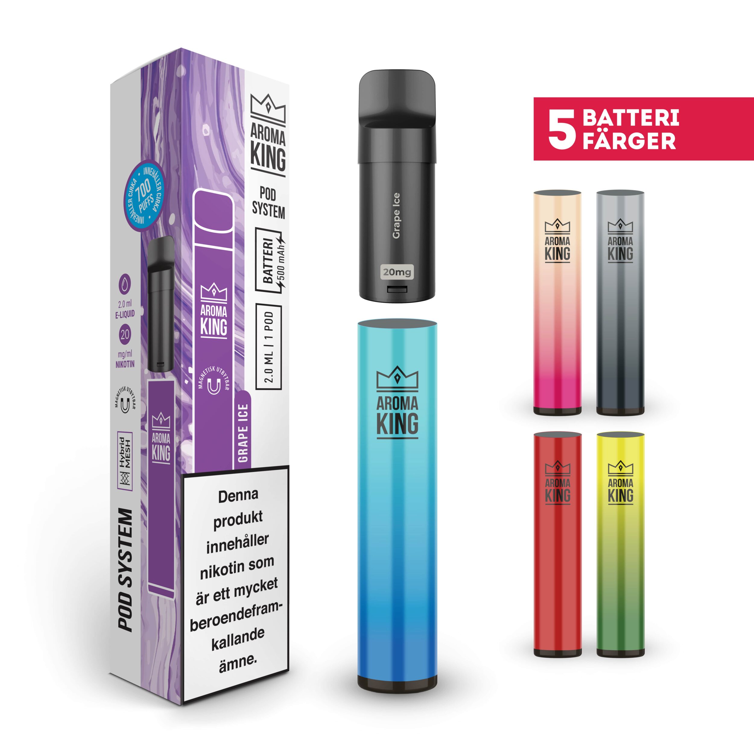 Aroma King Pod Classic Kit kommer med ett batteri och tillhörande POD med smak, samt en bruksanvisning.