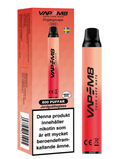 VapeM8 VM800 engångs vape är en disposable e-cigg från det svenska märket VapeM8. Kommer i flera olika smaker och två olika styrkor.