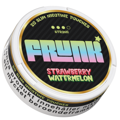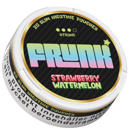 Frunk Slim Strawberry Watermelon är ett vitt snus, tobaksfritt snus med smak av jordgubb och vattenmelon. En dosa innehåller 20st prillor. Prillorna har slim-format och produkten har en stark nikotinstyrka, klassificerad som Strong (3 av 4). Nikotininnehållet är 9 mg per portion. Produkten är tillverkad i Sverige på uppdrag av N One Global AB.